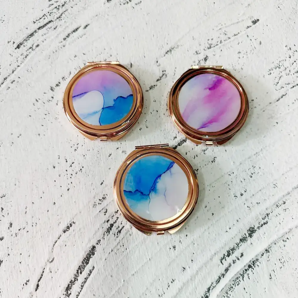 酒精畫除了可以造成六角板/杯墊、小物盤、掛畫、枱畫,還可以造成鏡盒。雖然手提電話都可以當鏡用,但電話隨時換,獨一無二的手作鏡盒,卻可以存放多時。和閨密一人一塊,加上對方名字,更是具心思又珍貴的回憶。